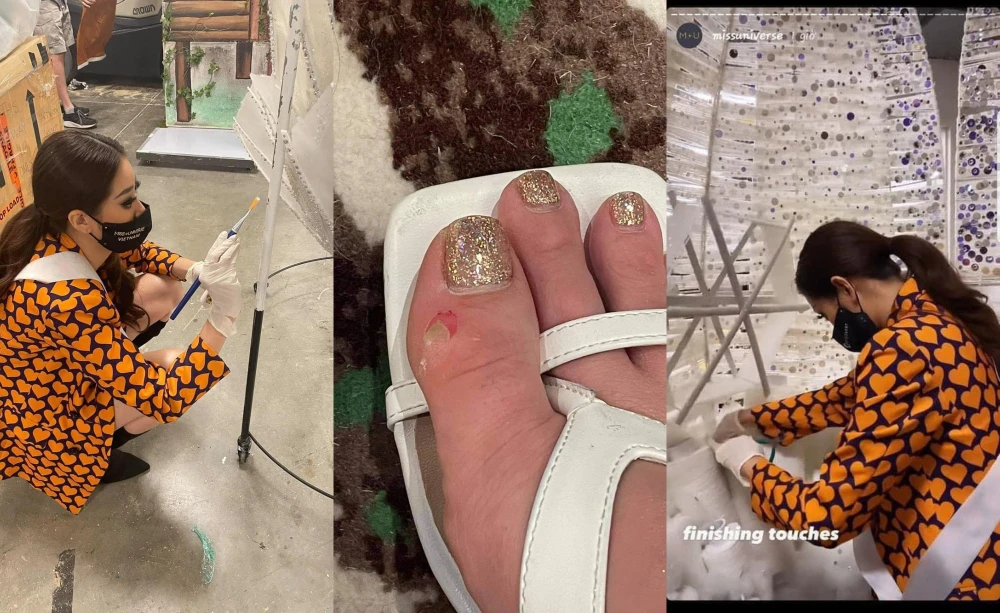 “Thương Khánh Vân vô cùng” là cảm xúc của nhiều người khi nhìn những hình ảnh Khánh Vân xắn tay áo tìm trong hộp đồ: kéo, kìm, ốc vít, nước sơn …để xử lý sự cố, sơn lại phần khung giá đỡ của trang phục, điềm tĩnh, kịp thời sửa lại các khớp trang phục bị lệch trước giờ G.