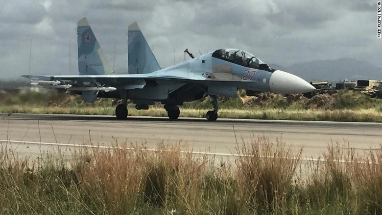 Tiêm kích Su-35 của Nga cất cánh từ căn cứ Khmeimim ở miền Bắc Syria. Ảnh: CNN