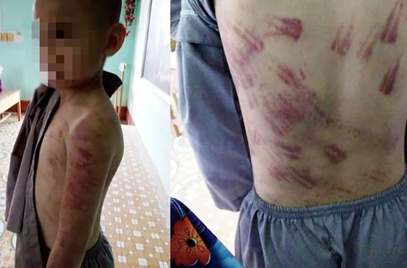 Hình ảnh bé trai bị sư chùa đánh đòn đến bầm tím người được cô giáo chụp lại vào năm học 2016-2017.