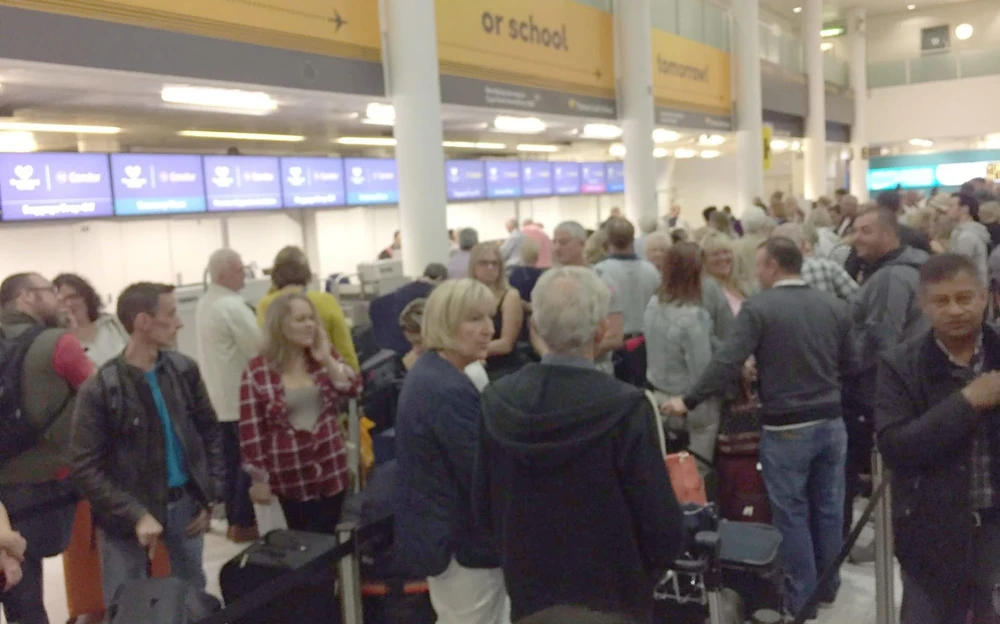 Rất nhiều hành khách bị gián đoạn check-in trong sáng ngày 28-9. Ảnh: Telegraph