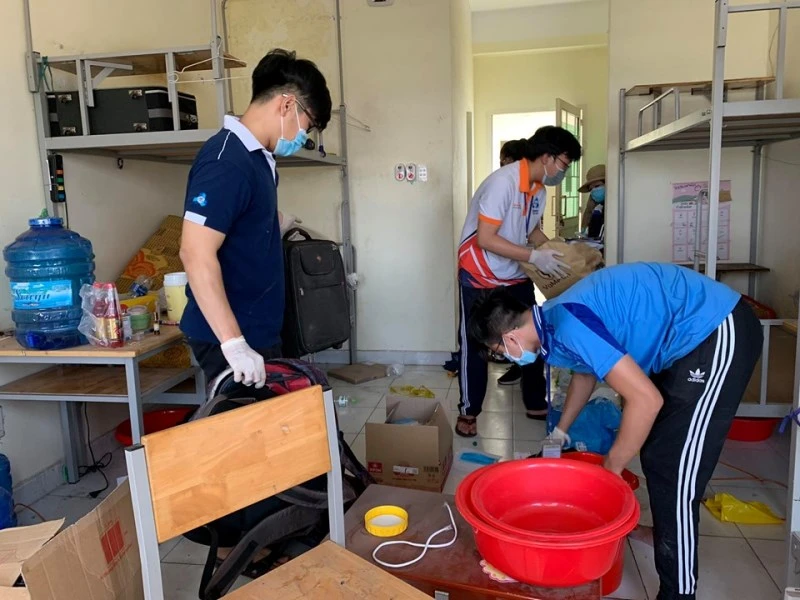 Các sinh viên, tình nguyện viên thu dọn đồ đạc trong KTX để làm nơi cách ly.