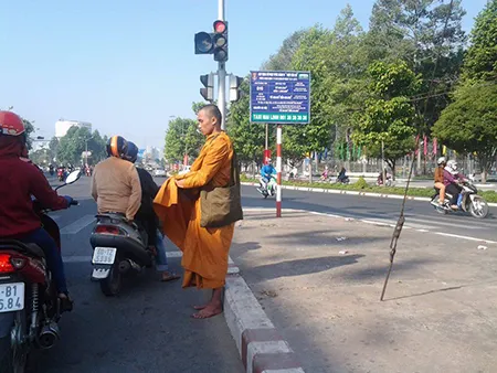 Cách vị trí “sư” trẻ khoảng 200 m, cũng tại góc ngã tư Công viên đài Kỷ niệm trên đường Nguyễn Ái Quốc, phường Trung Dũng có một vị “sư” nữ đứng cầm bình bát nhận tiền bố thí của người đi đường.