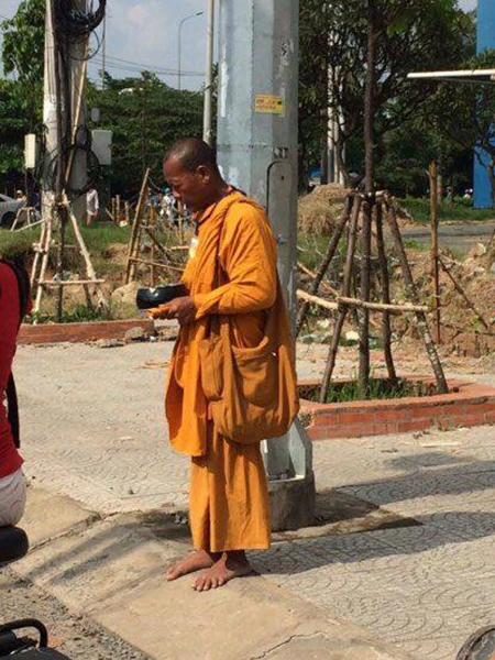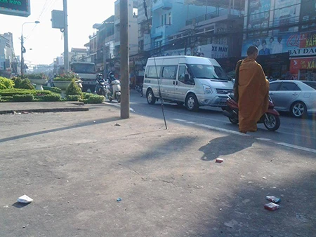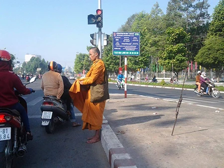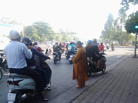 Bài bản hơn, tại góc ngã tư Vũng Tàu trên quốc lộ 51, phường Long Bình Tân, một “sư” già còn đeo một tấm thẻ trước ngực. Trên tấm thẻ in hàng chữ “Giáo hội Phật giáo Việt Nam, chùa Khánh Hội” để lấy lòng tin ở người dân. Ảnh: Quốc Minh