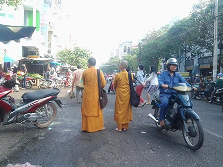 Còn tại khu vực chợ Biên Hòa trên đường Phan Chu Trinh, phường Hòa Bình có hai “ni cô” đứng giữa đường miệng liên tục niệm Phật để gây sự chú ý của người đi chợ.