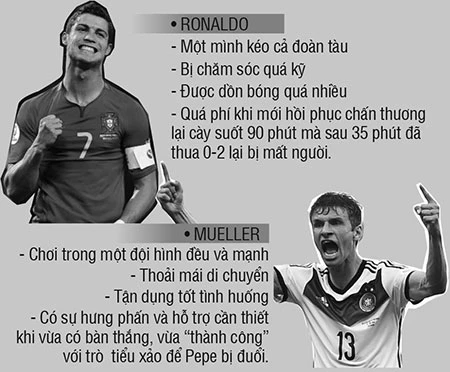 Đơn giản vì Mueller chơi trong một tập thể có tính đồng đội hơn và bản thân anh cũng chơi đồng đội hơn so với Ronaldo buộc cả đội đá cho mình và theo mình. Chỉ tiếc là pha bóng tiểu xảo để Pepe phải bị đuổi đã phần nào làm giảm đi chiến thắng của đội Đức và của cá nhân Mueller.