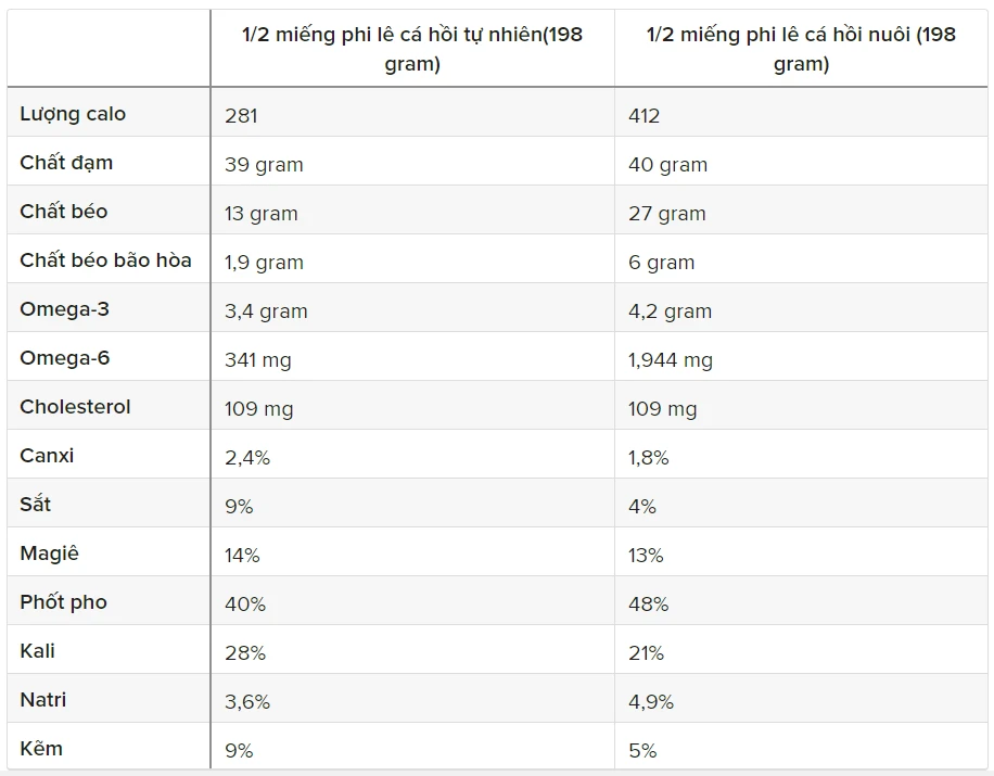 Bảng dưới đây cung cấp sự khác biệt về hàm lượng calo, protein và chất béo, vitamin, khoáng chất giữa cá hồi nuôi và cá hồi tự nhiên.