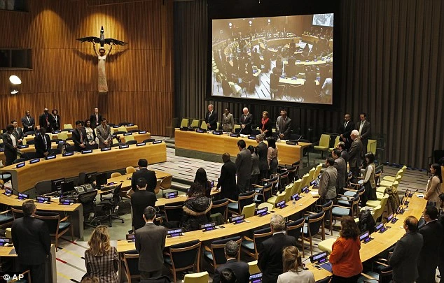 Các thành viên của Đại Hội đồng LHQ quan sát ông Vitaly Churkin phát biểu trong một phiên họp không chính thức của Đại Hội đồng LHQ. Ảnh: Daily Mail