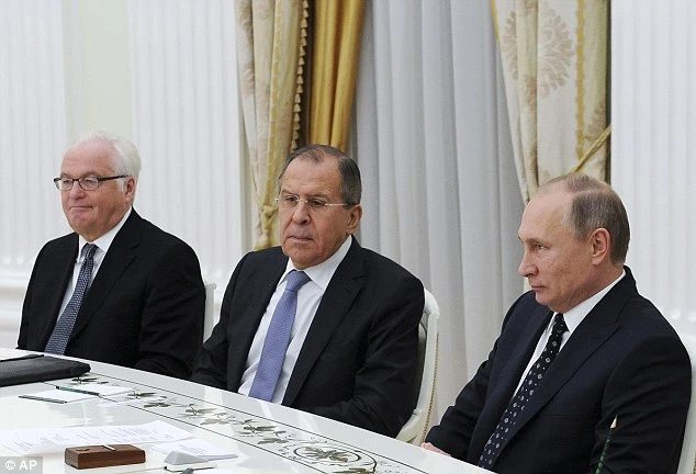Tổng thống Nga Vladimir Putin, Ngoại trưởng Nga Sergey Lavrov (giữa) và ông Vitaly Churkin (trái) trong một cuộc họp ở điện Kremlin hồi tháng 11-2016. Ảnh: Daily Mail