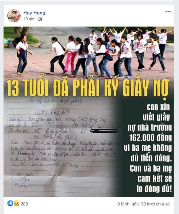 Hai ngày nay, mạng xã hội xôn xao, lan truyền hình ảnh học sinh lớp 7, Trường THCS Hưng Tây (xã Hưng Tây, Nghệ An) viết giấy báo nợ 162.000 đồng với cam kết em và gia đình sẽ lo đóng đủ.