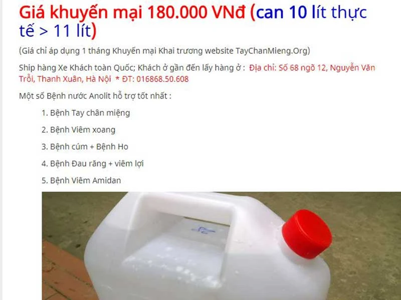 | Các bác sĩ mà PV Pháp Luật TP.HCM tiếp xúc đều không biết về dung dịch mang tên anolyte. Theo các thông tin trên mạng thì dung dịch anolyte là sản phẩm của quá trình điện phân nước muối loãng (khoảng 5‰). Nước này có nhiều tác dụng như bảo quản nông sản, chữa trị bệnh lở mồm long móng ở gia súc, chữa nấm, bệnh ngoài da, hôi chân, hôi nách, tay-chân-miệng, HIV… Tuy nhiên, chưa hề có một nghiên cứu y khoa lâm sàng khẳng định khả năng trị bệnh của dung dịch này. |
