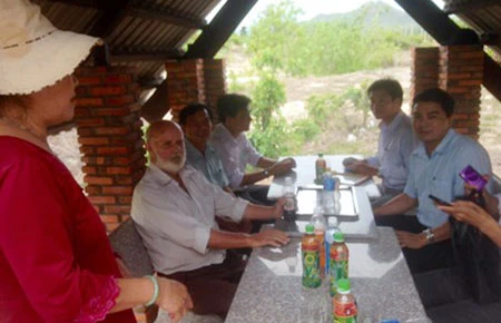 Ông Kurt Lender Jensen cùng Bí thư huyện ủy Tuy Phong thực địa mảnh đất ven QL 1A nơi ông bà đang xin hợp thức hóa giấy tờ.