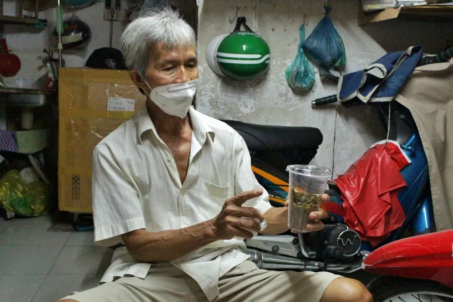 Ông Bùi Trung Nhơn (56 tuổi, ngụ quận 3, TP.HCM) bán chè ở ngã tư Cách Mạng Tháng Tám – Nguyễn Đình Chiểu (quận 3). Mỗi ngày, ông Nhơn chỉ chuẩn bị có chín ly chè nhưng có hôm vẫn không bán hết. Chè ế, ông đem về nhà ăn trừ cơm.