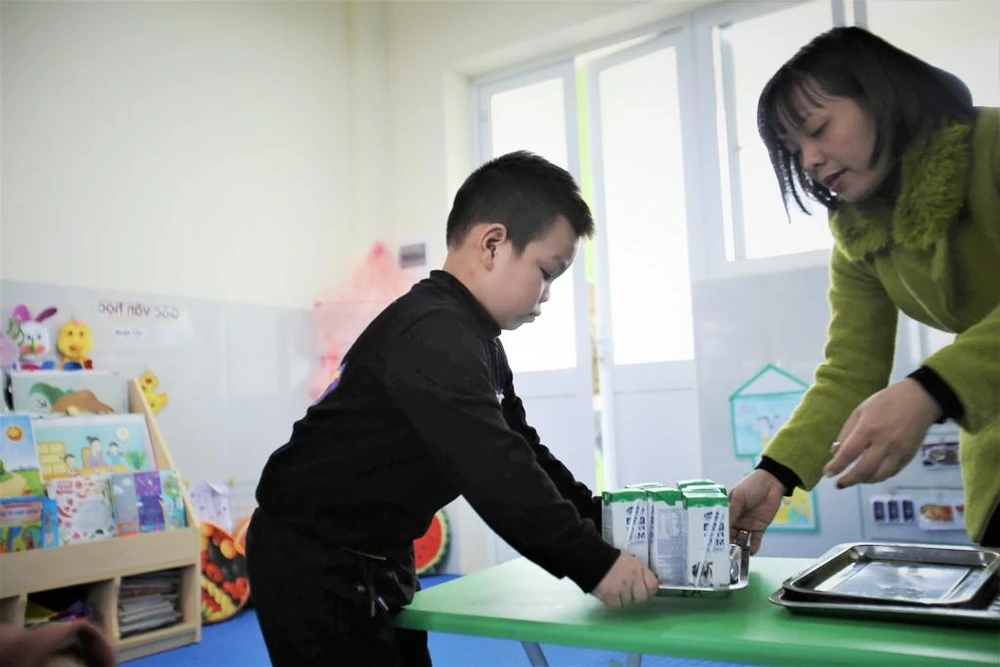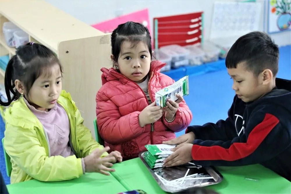 Bà Khúc Thị Mai, Hiệu trưởng Trường Mầm non Bà Triệu, Hoàn Kiếm, Hà Nội khẳng định: giờ uống sữa đã trở thành thời điểm được học sinh yêu thích trong ngày. Các con cùng uống sữa theo nhóm và sau đó rất hào hứng với “tiết mục” gấp vỏ hộp sữa.