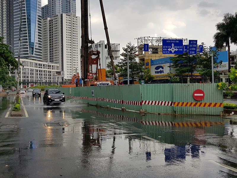 Ghi nhận của PV, chiều 14-4, khu vực này xuất hiện một cơn mưa dù không quá lớn nhưng tuyến đường đã xuất hiện nhiều chỗ trũng nước. tại khu vực thi công của dự án, ngoài khu vực thi công khoan cọc ở khu chung cư The Manor thì mũi thi công thứ hai dưới dạ cầu Thủ Thiêm chỉ đang tập kết vật liệu.