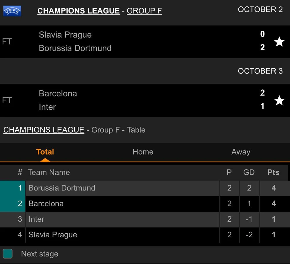 Giành chiến thắng kịch tính trên sân nhà, Barcelona có được 4 điểm sau hai lượt trận. Mặc dù cùng điểm số với Dortmund, thế nhưng Barcelona chỉ có được vị trí thứ 2 tại bảng F do thua đại diện đến từ nước Đức về mặt hiệu số. Ở cặp đấu còn lại của bảng F “tử thần”, Dortmund cũng có được chiến thắng trên đất cộng hòa Séc khi đánh bại Savia Prague với tỷ số 2-0.
