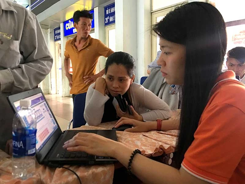 Hành khách đăng ký mua vé tàu Tết 2018 tại ga Sài Gòn. Ảnh: HỒNG TRÂM