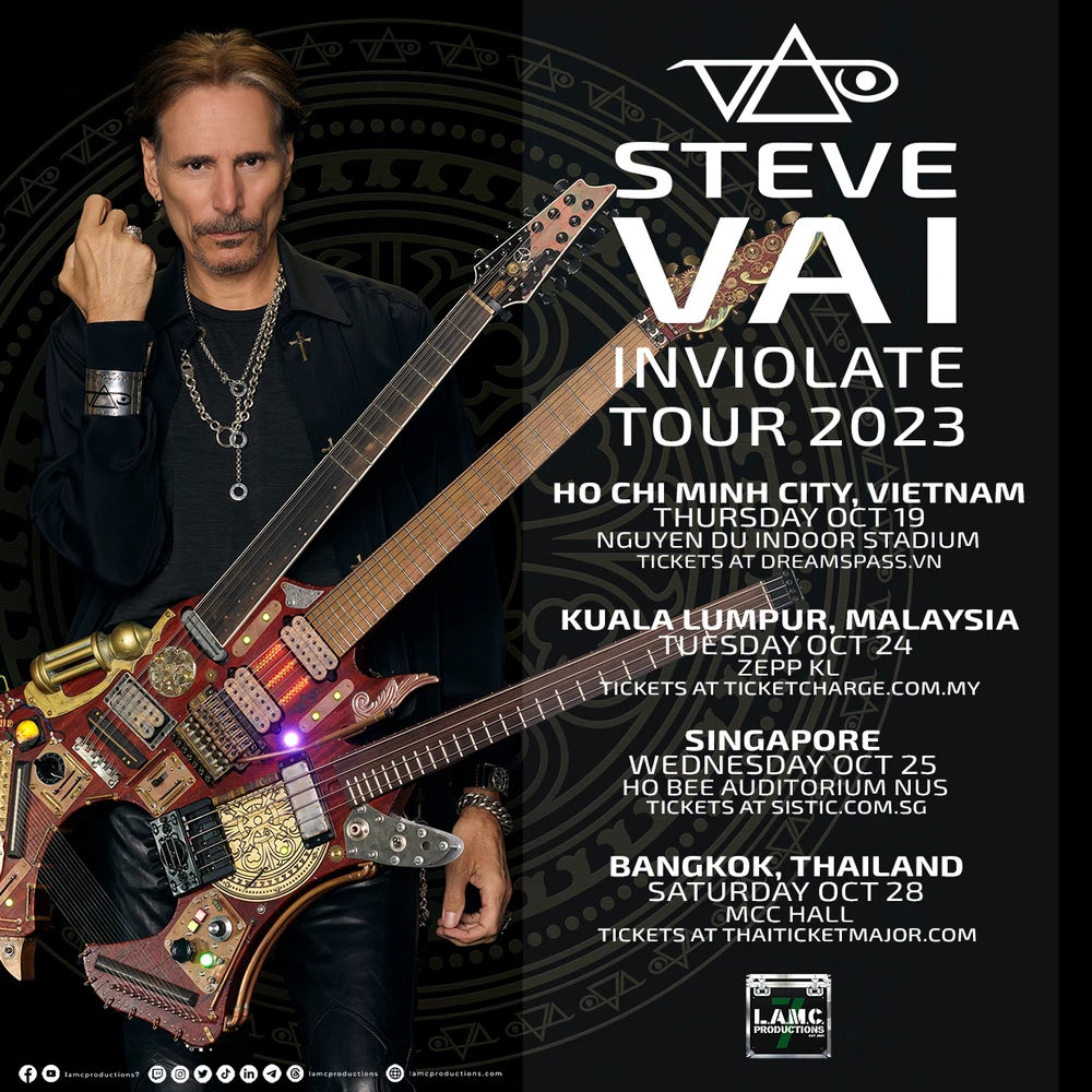 Theo chia sẻ trên Fanpage chính thức của Steve Vai, nam nghệ sĩ cho biết trong lưu diễn vòng quanh thế giới vào tháng 10 tới ông sẽ đến 4 quốc gia Đông Nam Á gồm Việt Nam, Malaysia, Singapore & Thái Lan.