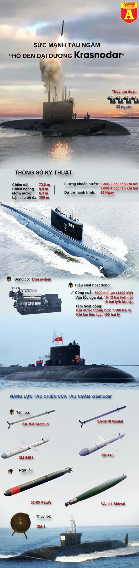 Tàu ngầm Krasnodar được coi là vũ khí tấn công 'đáng gờm' dưới lòng biển của Nga. So với những chiếc Kilo 636 trước đây, những chiếc Kilo 636,3 được trang bị công nghệ tàng hình tiên tiến, có khả năng chiến đấu kéo dài và khả năng tấn công mặt đất, trên mặt nước và các mục tiêu dưới nước.