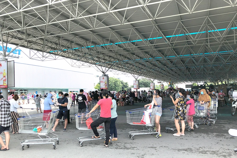 Người dân xếp hàng chờ mua thực phẩm tại siêu thị. Ảnh: THU HÀ