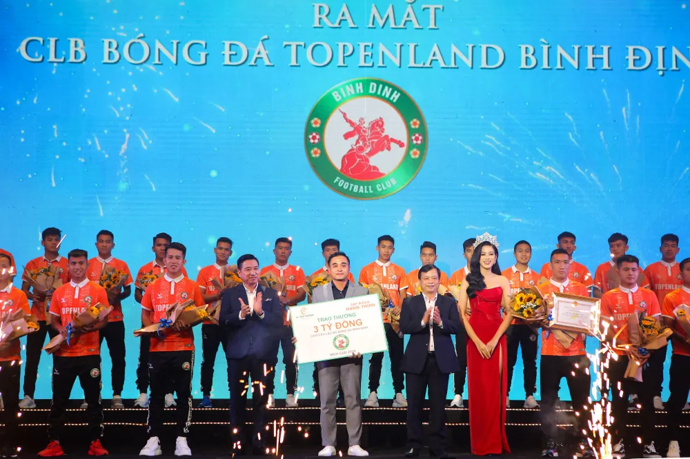 Ông Nguyễn Tuấn Thanh - Ủy viên Ban thường vụ Tỉnh ủy, Phó Chủ tịch Thường trực UBND tỉnh Bình Định cùng ông Nguyễn Đình Trung, Chủ tịch Tập đoàn Hưng Thịnh và Hoa hậu Đỗ Thị Hà trao bằng khen, hoa và tiền thưởng 3 tỉ đồng của Tập đoàn Hưng Thịnh cho CLB bóng đá Bình Định cũng như chứng kiến phần ra mắt của Topenland Binh Dinh FC.