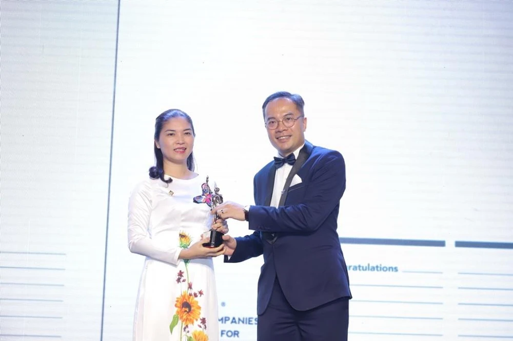 Bà Trần Thị Mỹ Hạnh - Phó TGĐ Tập đoàn Sun Group đại diện nhận giải thưởng Top 50 doanh nghiệp có môi trường làm việc tốt nhất châu Á 2019.