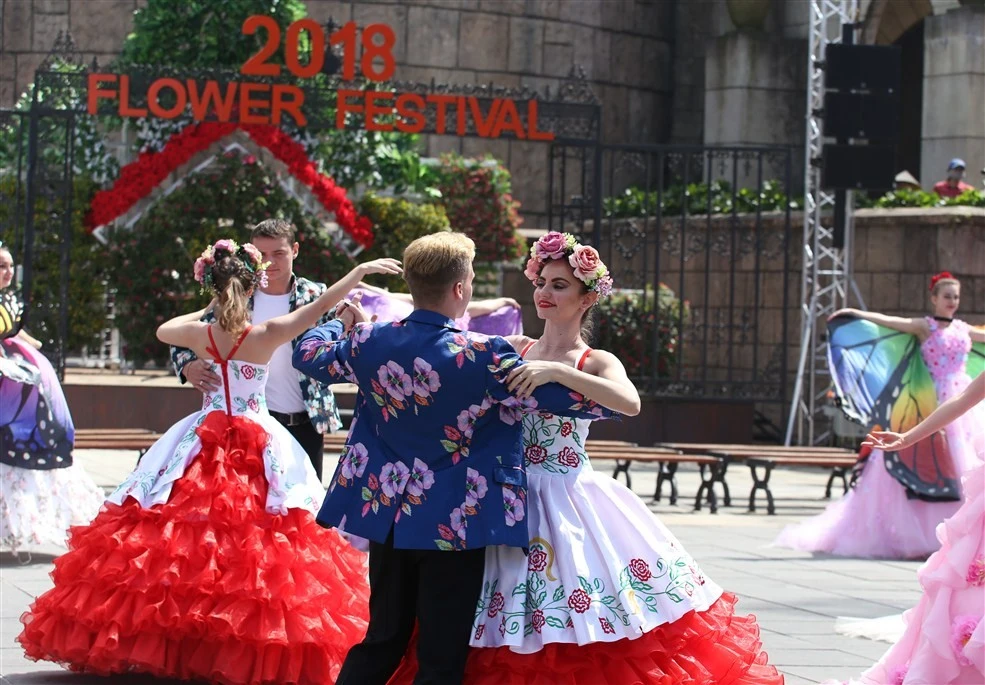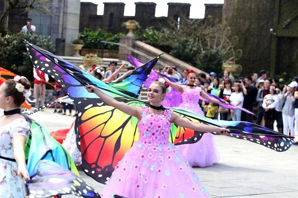 Không chỉ bị mê hoặc bởi những màu hoa, hàng ngàn du khách còn thực sự bị “đốn tim” với những cô gái tóc vàng trong bộ trang phục lộng lẫy những màu hoa với bướm… Cả một vườn hoa xuân được tái hiện thật lộng lẫy trong 3 suất trình diễn Carnival (lễ hội hóa trang) mỗi ngày