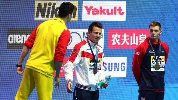 Trên bục nhận giải, kình ngư người Anh Duncan Scott từ chối đứng chung bục với Sun Yang, giống như VĐV người Úc Mack Horton đã thực hiện sau khi để thua “gã khổng lồ” Trung Quốc tại chung kết 400 m tự do mam.