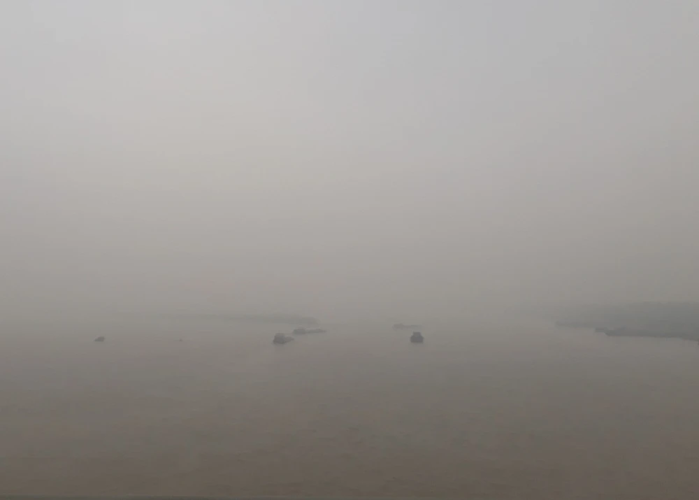 Sương mù trên sông Hồng, các tàu thuyền chìm khuất trong sương, tầm nhìn xa bị giảm rất nhiều.