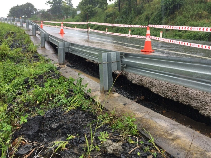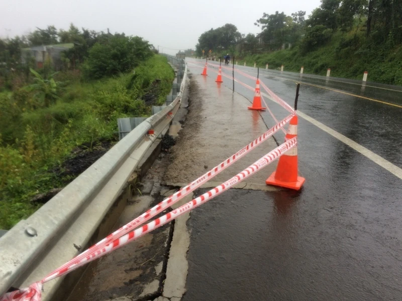 Theo ông Nhàn, vết sạt lở xảy ra tại khu vực đèo dốc, kéo dài khoảng 20 m, ăn sâu vào tim đường khoảng 1,5 m, đất dưới mặt đường sụp sâu xuống khoảng 0,5 m tạo thành hàm ếch.