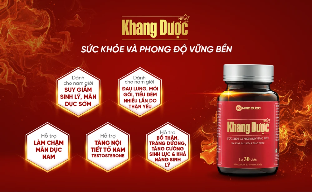 Khang Dược đã tốt, Khang dược New nay còn tốt hơn. Khang Dược New với công thức cải tiến được phát triển bởi công ty Nam Dược (đơn vị dược phẩm đầu tiên được Thủ tướng 2 lần trao tặng giải thưởng danh giá "Giải vàng chất lượng quốc gia) - kết hợp 5 loại dược liệu rừng và biển gồm sá sùng, hàu biển, bá bệnh, sâm cau, dâm dương hoắc, giúp hỗ trợ tăng sinh lý, cường sinh lực, phục hồi bản lĩnh phái mạnh.Sản phẩm từng vinh dự nhận giải “Huy chương vàng vì sức khỏe cộng đồng” năm 2019.
