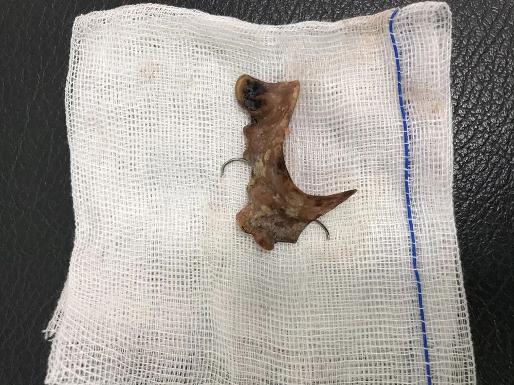 Hàm răng giả tháo lắp 20 năm tuổi lấy ra từ họng bệnh nhân. Ảnh: Hải Dương