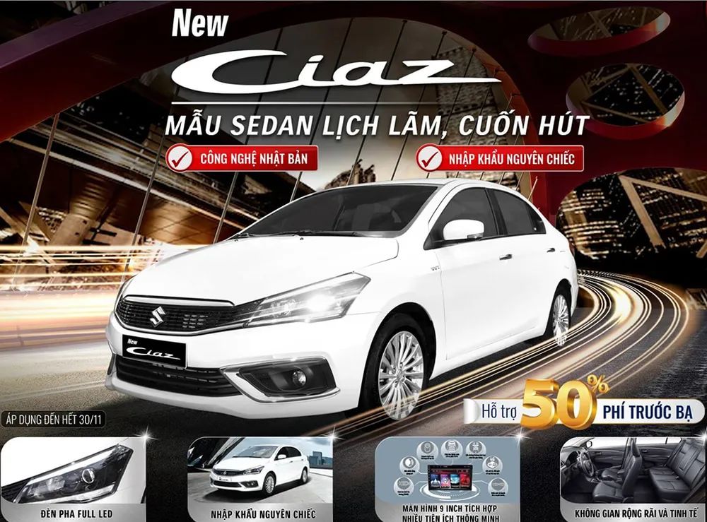 Với mức giá niêm yết 529 triệu đồng và hỗ trợ 50% phí trước bạ của Việt Nam Suzuki, mẫu sedan nhập khẩu nguyên chiếc Ciaz mới sở hữu loạt tính năng ưu việt và ngoại hình thanh lịch, được coi là lựa chọn phù hợp, sáng suốt dành cho các doanh nhân tự hào với sự khác biệt của mình, không bị lẫn lộn vào đám đông.