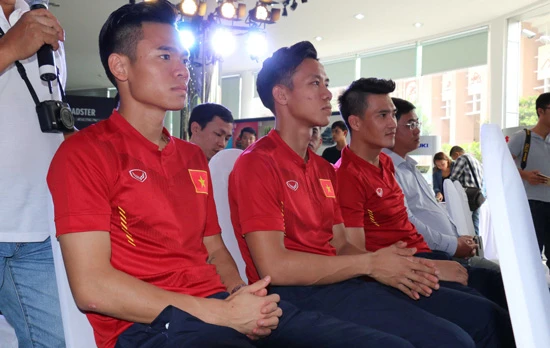 Các tuyển thủ Nguyên Mạnh, Ngọc Hải và Công Vinh tại lễ ký kết tài trợ.
