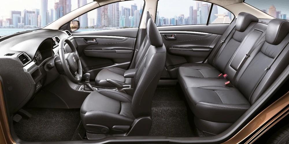 Nội thất Ciaz được thiết kế thông minh để tận dụng tối đa không gian, tạo cảm giác thoải mái cho người lái cùng hành khách ngồi trên xe. Một số trang thiết bị đi kèm đáng chú ý khác như chìa khóa thông minh, hệ thống khởi động xe bằng nút bấm không cần khóa, hệ thống điều hòa tự động, hệ thống âm thanh DVD 4 loa, màn hình giải trí cảm ứng thông minh 7 inch, camera lùi…