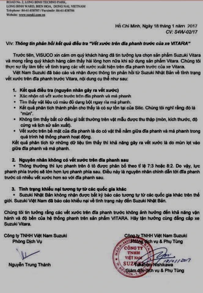Ngày 18-1, Suzuki Việt Nam có văn bản trả lời khách hàng do ông Takehiko Nishikawa (Giám đốc bộ phận dịch vụ phụ tùng Suzuki Việt Nam) ký với câu trả lời rất huề vốn.