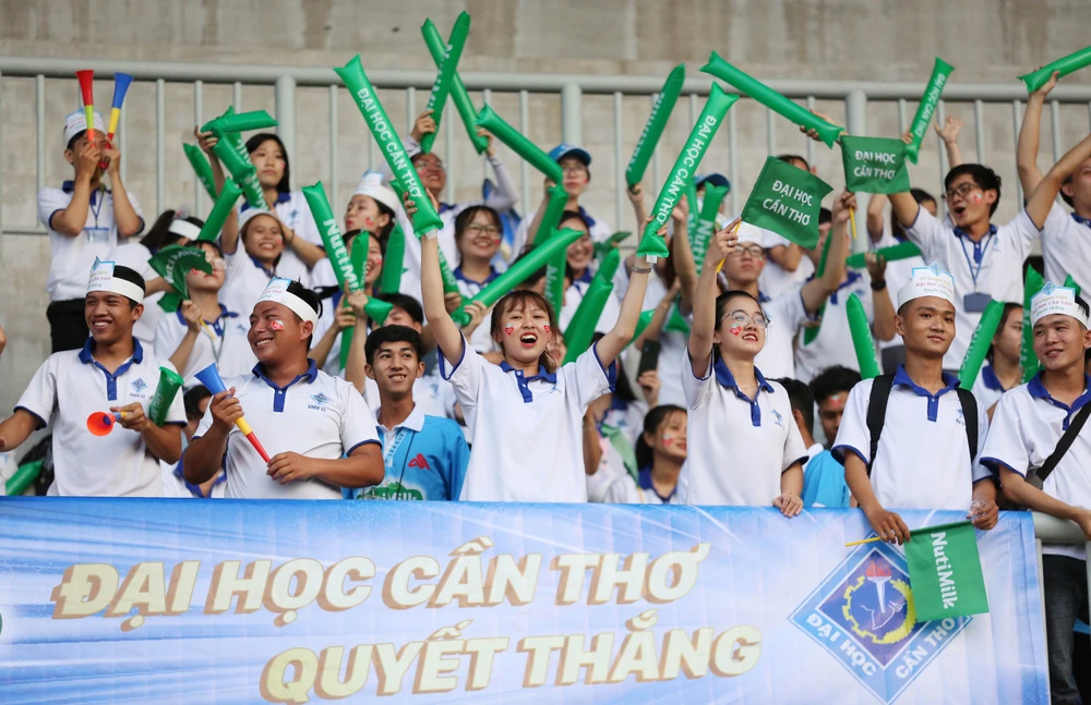 ... và sự tri ân cổ động viên giàu tình cảm của cầu thủ sinh viên. Ảnh: ANH THÔNG.