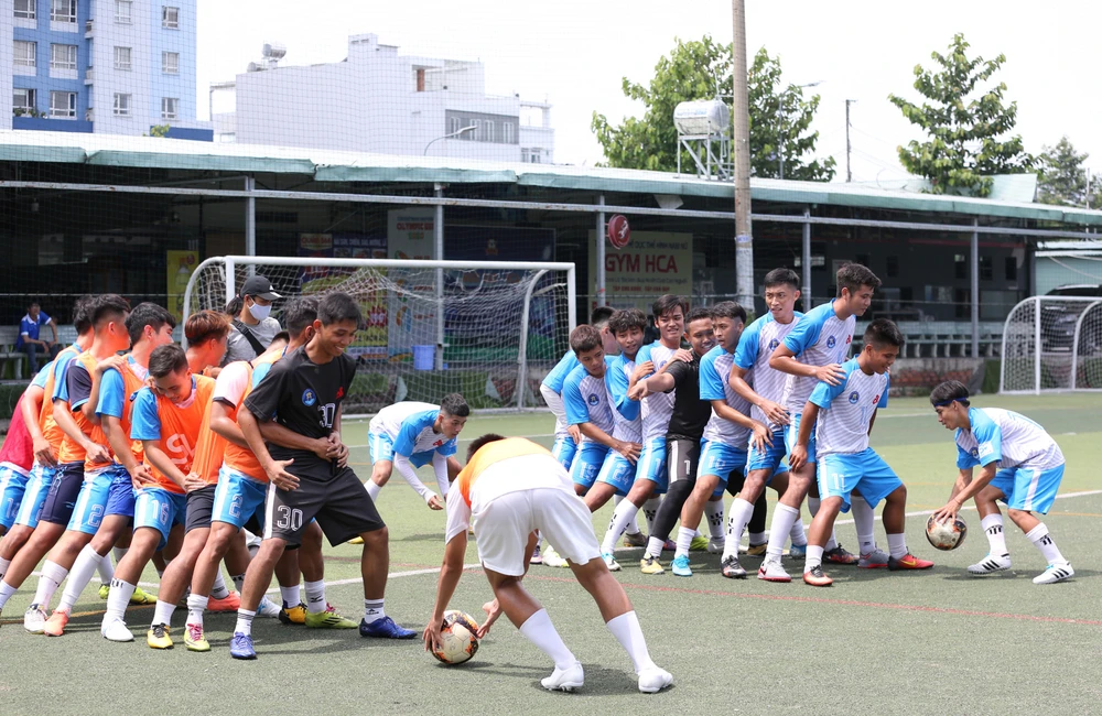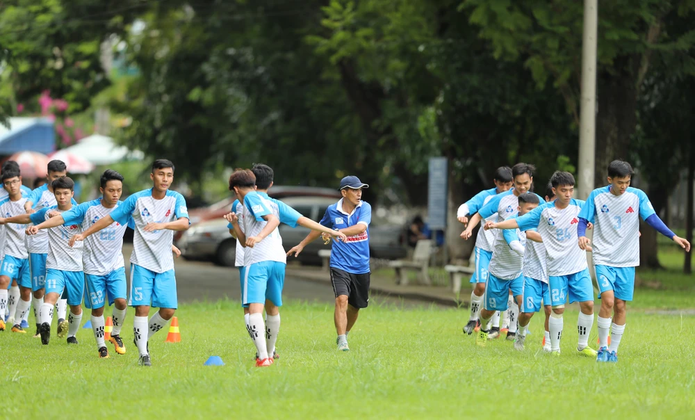 Cầu thủ trường Đại học Văn Hiến tập bóng vui nhộn trước giờ xung trận giải SV-Legue 2020. Ảnh: AN.