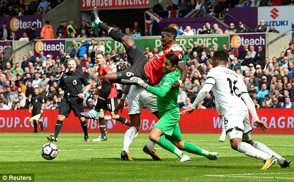 Pogba tâng bóng qua đầu Fabianski nâng tỉ số lên 3-0.