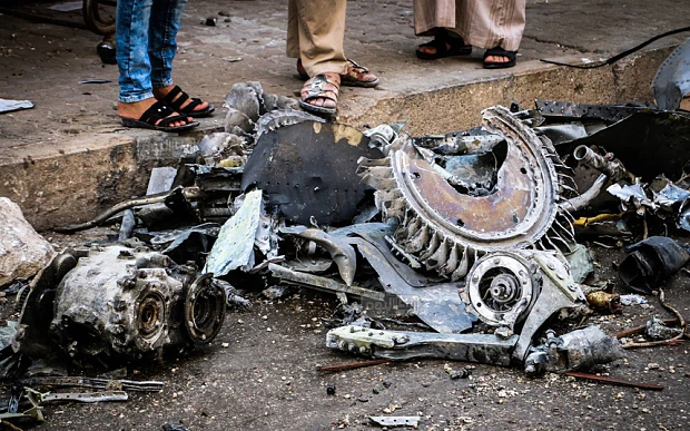 Một phần mảnh vỡ của máy bay quân đội Syria sau khi chiến đấu cơ này rơi xuống khu chợ (ảnh: AP)