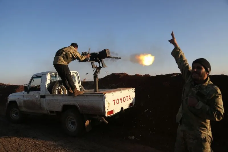 Các chiến binh Quân đội Syria tự do (FSA) được Thổ Nhĩ Kỳ hậu thuẫn nã pháo sang vị trí YPG ở khu vực Afrin hôm 20-1. Ảnh: AFP