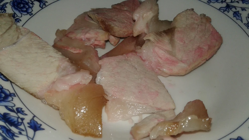 Phần thịt luộc để qua đêm chuyển sang màu hồng khiến chị Trà hoang mang.