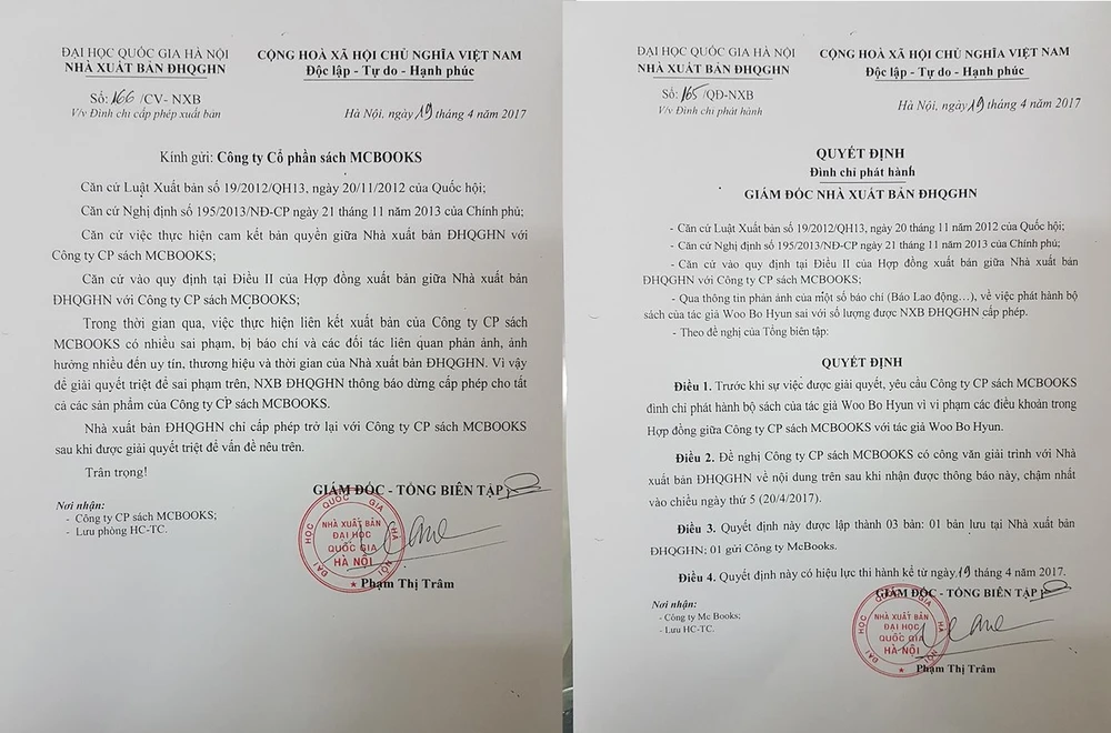 Văn bản và quyết định của NXB ĐH Quốc gia Hà Nội thông báo dừng cấp phép cho tất cả sản phẩm của MCBooks. Ảnh: HB