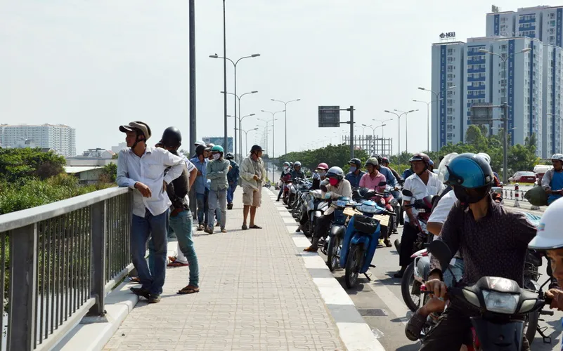 Người dân hiếu kì tập trung trên cầu Rạch Cây (quận 8) theo dõi vụ việc.