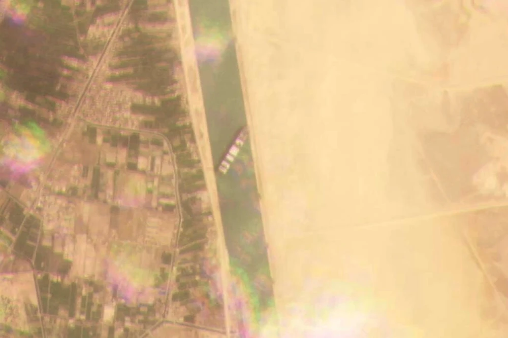 Hình ảnh vệ tinh tàu Ever Given bị mắc kẹt trên kênh đào Suez. Ảnh: AP