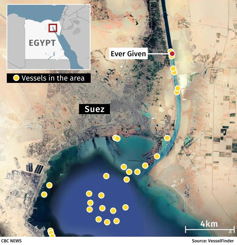 Tàu Ever Given treo cờ Panama, dài 400 mét, có trọng tải 224.000 tấn đang trên hải trình từ Trung Quốc tới cảng Rotterdam (Hà Lan) thì đã bị mắc cạn từ sáng 23-3, giờ địa phương (tức đầu giờ chiều 23-3, theo giờ Việt Nam). Cơ quan quản lý kênh đào Suez cho biết các trận bão cát đã khiến các thủy thủ "không thể điều hướng con tàu".