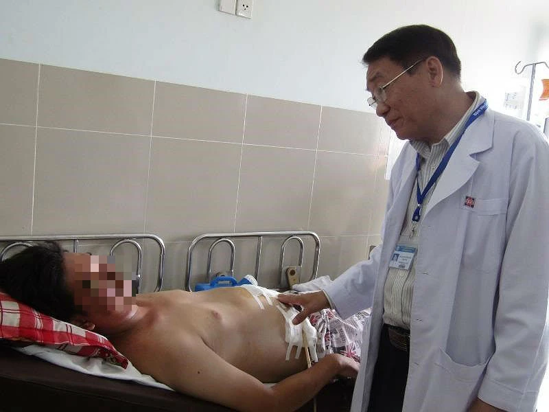 Bác sĩ thăm hỏi sức khỏe anh L. sau khi phẫu thuật lấy nấm đông cô ra khỏi ruột. Ảnh: NGỌC DIỄM
