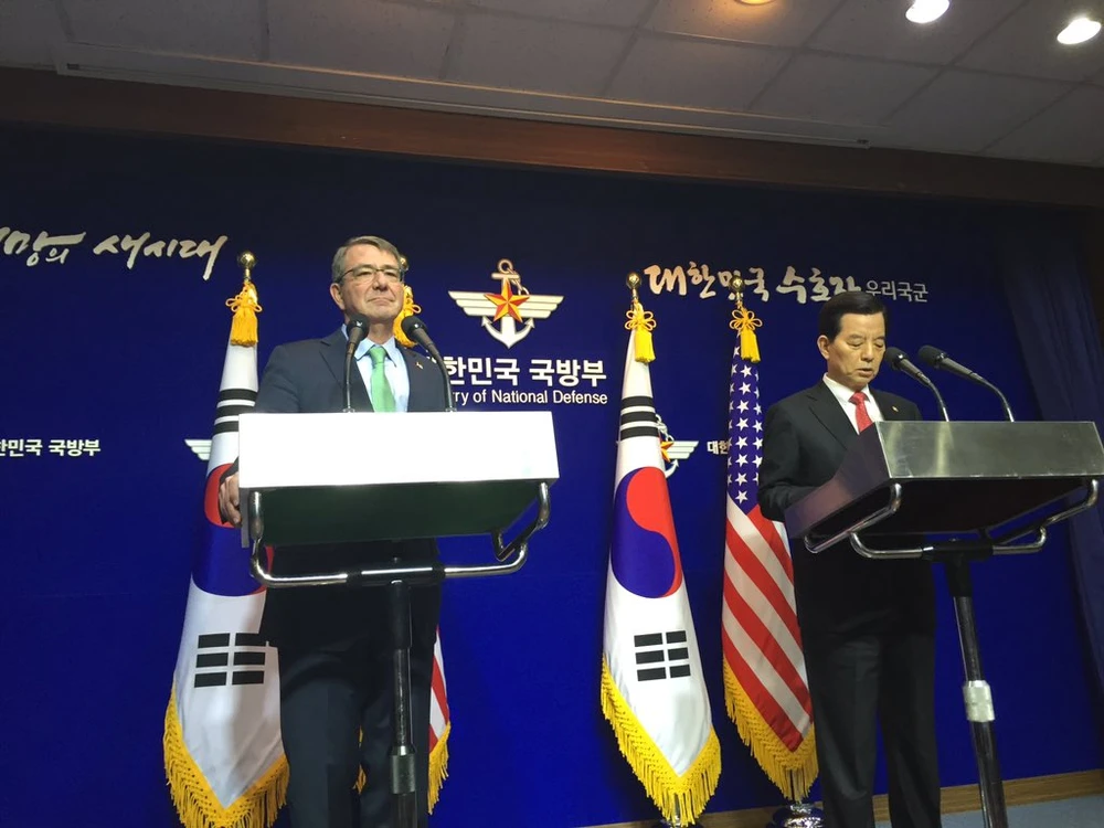 Ông Carter và người đồng cấp của Hàn Quốc đã chủ trì một cuộc họp báo vào sáng nay (theo giờ Việt Nam), sau một chuỗi các cuộc họp mặt của các lãnh đạo cấp cao Mỹ và Hàn Quốc.
