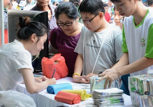 Nếu như hoạt động thu gom vỏ chai nhựa, lon nhôm tại khu vực của PepsiCo rất rôm rả thì người dân lại “ùn ùn” xếp hàng đổi vỏ hộp sữa lấy quà tại quầy của TetraPak. Cứ 50 vỏ hộp sữa đã sử dụng đổi được bốn hộp sữa mới và số vỏ còn lại sẽ được công ty thu mua 2.000 đồng/kg. Đặc biệt, góc Cũ người mới ta của Quỹ Bảo vệ môi trường TP.HCM năm nay lại hoành tráng hơn. Các vật phẩm sách vở, đồ dùng đã qua sử dụng được người dân mang tới để đổi những món đồ khác. Gian hàng thu gom chất thải có thể tái chế, đổi chất thải nguy hại lấy quà của quỹ cũng không kém cạnh bằng việc tặng quà, thu gom các loại pin, bóng đèn hư cũ, vỏ chai, lọ đựng hóa chất… Song song đó là các hoạt động trưng bày triển lãm các sản phẩm handmade, sản phẩm làm từ vật liệu tái chế; mô hình xử lý chất thải điện tử; tuyên truyền các hoạt động bảo vệ môi trường… cũng được Chi cục Bảo vệ môi trường, tổ chức ENDA, Công ty Môi trường đô thị TP.HCM, Ắc quy GS, CLB Yêu môi trường ĐH Nông Lâm TP.HCM… truyền tải sinh động đến người dân. Không những vậy, ngày hội còn trưng bày các tác phẩm tham gia cuộc thi Sức sống mới từ phế thải của các em học sinh trên địa bàn TP thực hiện.
