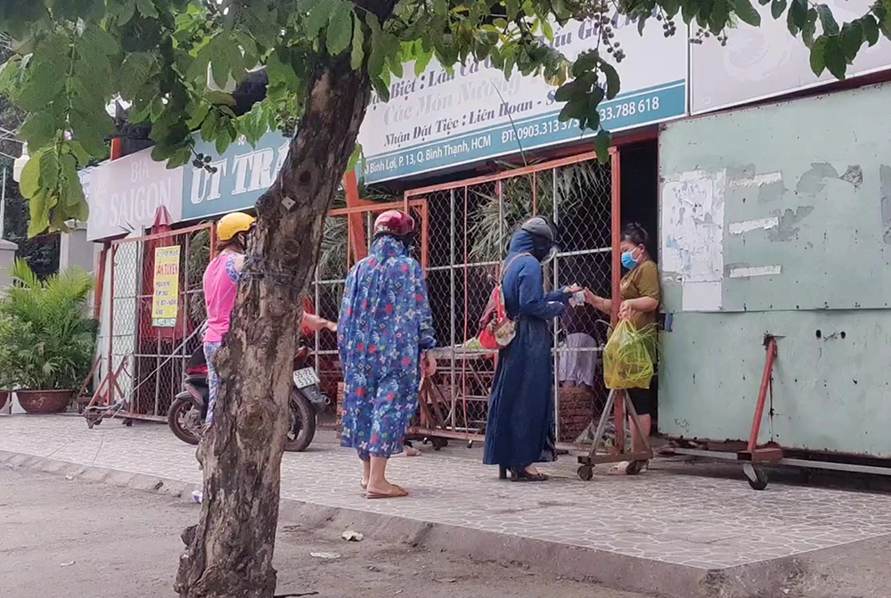 Bán rau củ qua hàng rào một quán nhậu thu hút nhiều người mua hàng vào chiều 14-7. Ảnh: NGUYỄN YÊN