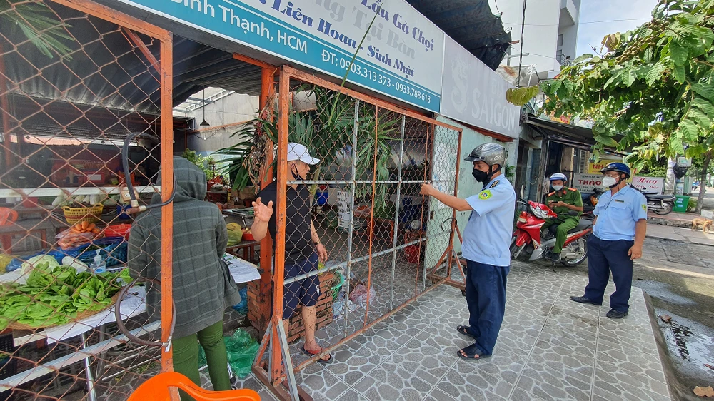 Lực lượng UBND phường 13 làm việc với hộ kinh doanh mở bán "chui" bất chấp dịch COVID-19. Ảnh: NGUYỄN YÊN